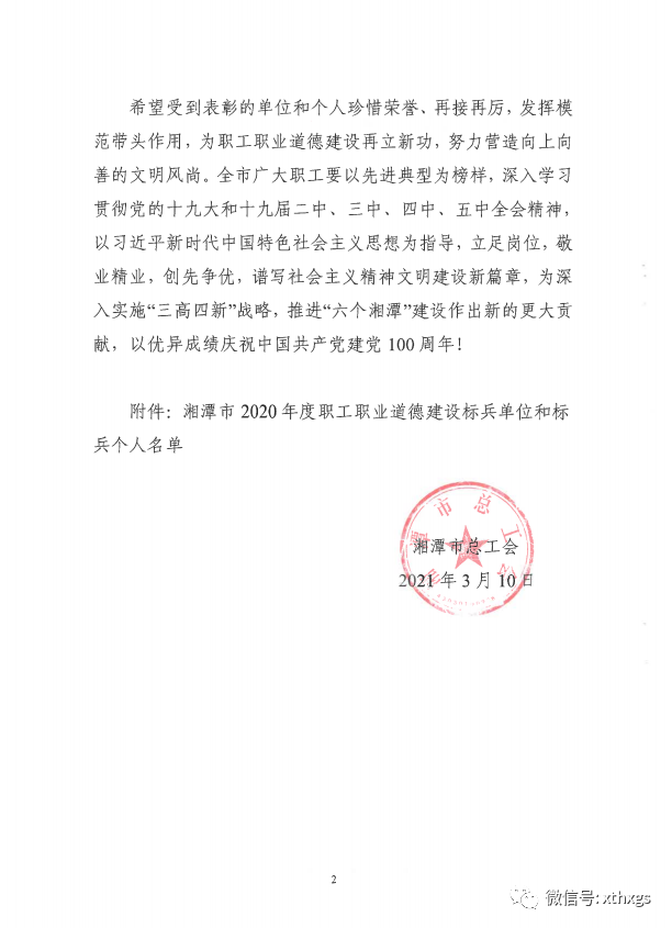 熱烈慶?!鞠嫣逗阈馈勘皇谟?020年度湘潭市職工職業(yè)道德建設標兵單位。