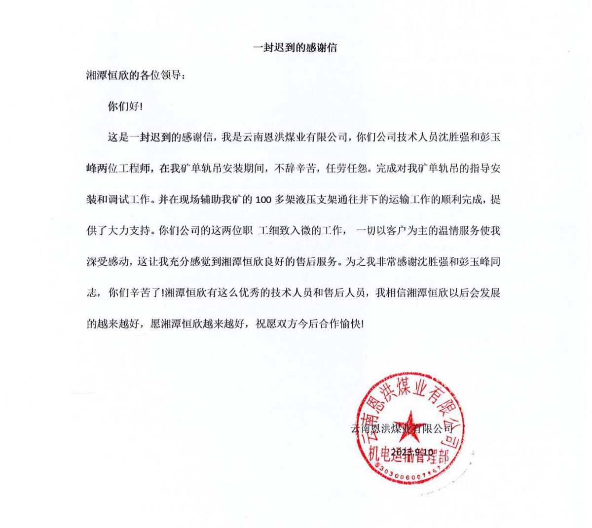 獲得云南恩洪煤業(yè)有限公司的表揚(yáng)信,沈勝強(qiáng)和彭鈺峰指導(dǎo)完成單軌吊的安裝和調(diào)試工作,并順利將100架液壓支架運(yùn)往井下表示感謝。