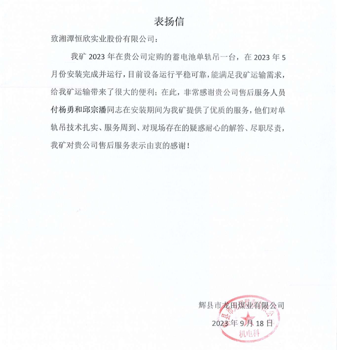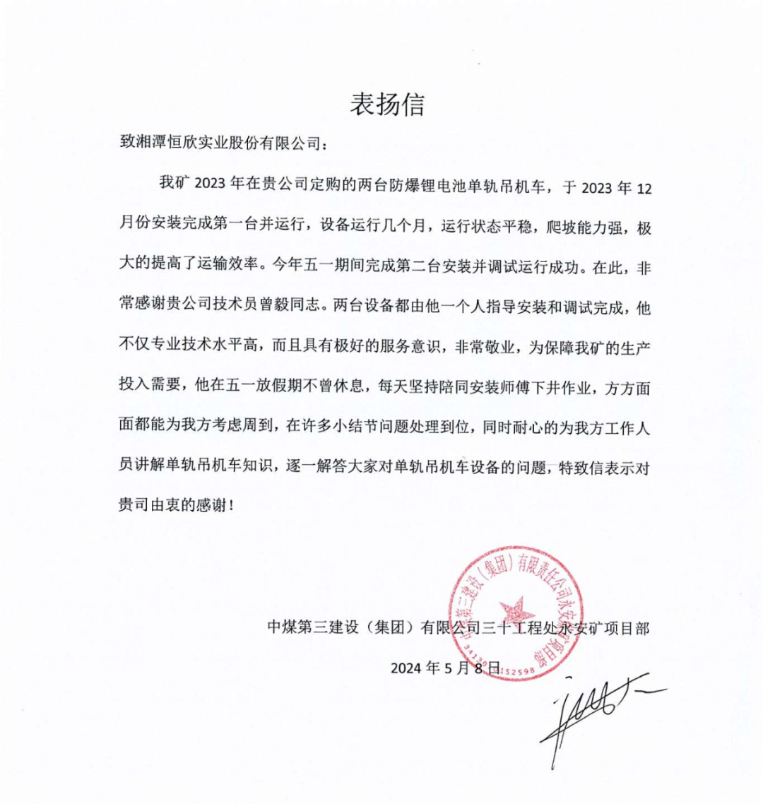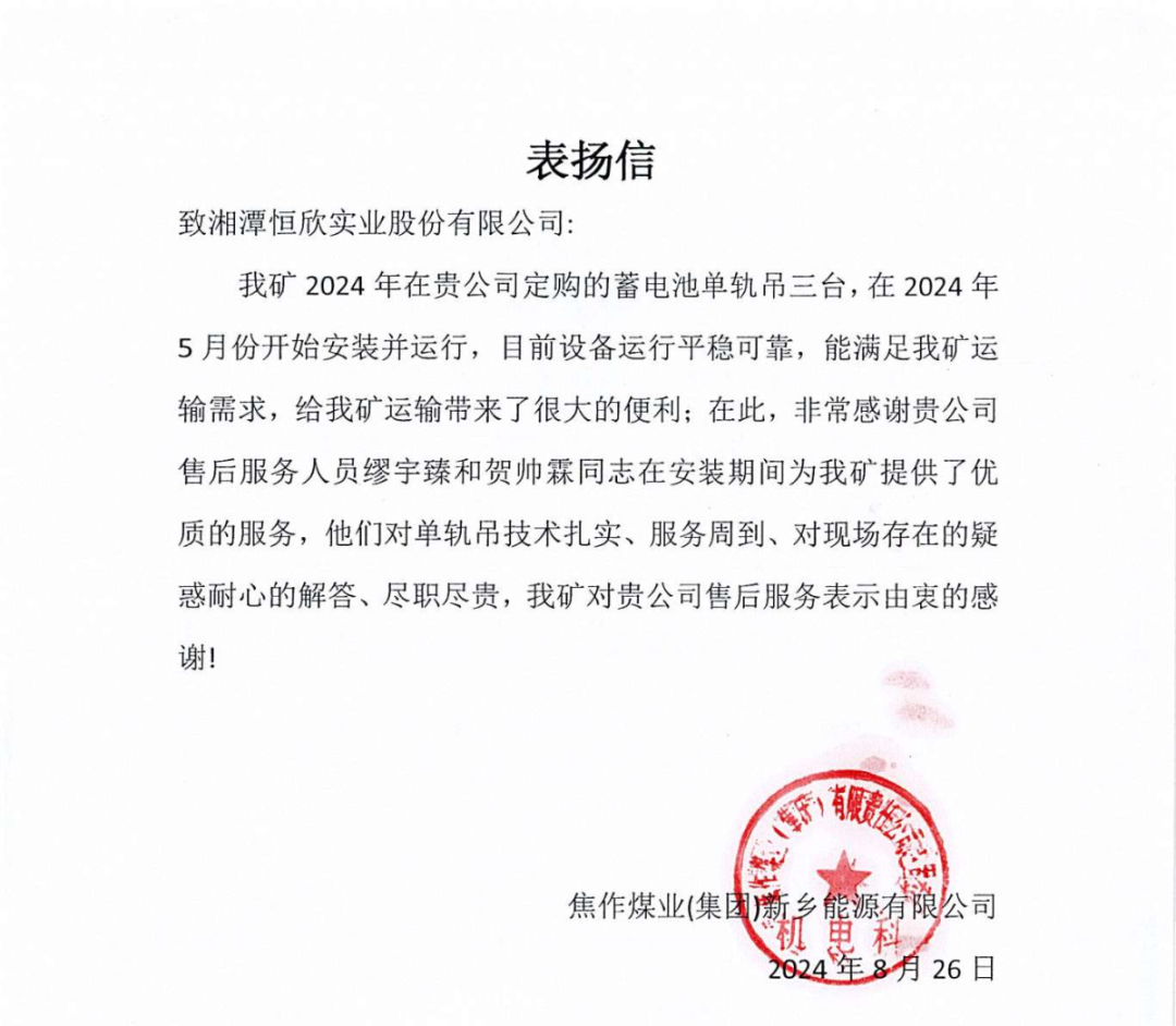 【恒欣股份】喜獲多封客戶含“贊”量頗高的表揚(yáng)信,生產(chǎn)的單軌吊產(chǎn)品性能和售后服務(wù)給予了高度評價(jià),肯定了單軌吊在煤礦井下運(yùn)輸效率高、爬坡能力強(qiáng),適應(yīng)性好、安全性能高、綠色環(huán)保等特點(diǎn)。同時(shí),客戶對售后服務(wù)團(tuán)隊(duì)的專業(yè)技能、快速響應(yīng)和敬業(yè)精神表示欽佩,對【恒欣股份】組織開展線上和線下的技術(shù)交流會(huì)表示非常的認(rèn)可,不僅提升了礦山企業(yè)對設(shè)備安全運(yùn)行的管理水平,還確保礦工的人身安全和設(shè)備的安全穩(wěn)定運(yùn)行。