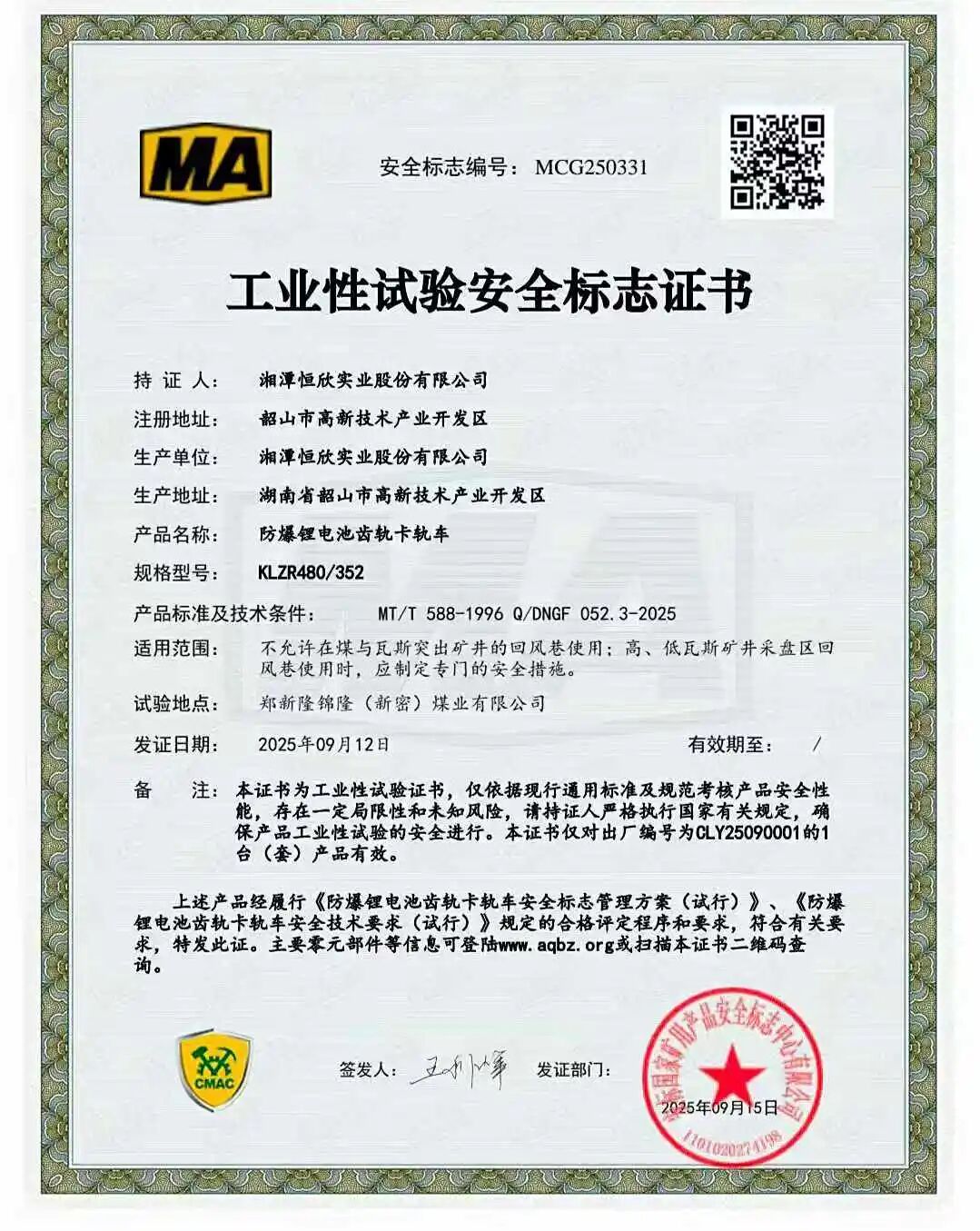 喜訊!【恒欣股份】科研團(tuán)隊(duì)歷時(shí)十個(gè)月技術(shù)攻關(guān)下成功面世的永磁變頻一體機(jī)系列的防爆鋰電池齒軌卡軌車,取得業(yè)內(nèi)首批礦用產(chǎn)品安全標(biāo)志證書。這一重要突破,標(biāo)志著【恒欣股份】在礦山智能運(yùn)輸裝備領(lǐng)域已走在行業(yè)前沿。