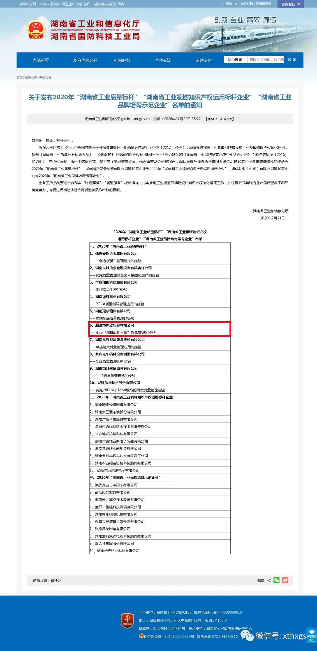 xiao12666@163.com熱烈慶祝【湘潭恒欣】被認(rèn)定為2020年“湖南省工業(yè)質(zhì)量標(biāo)桿”