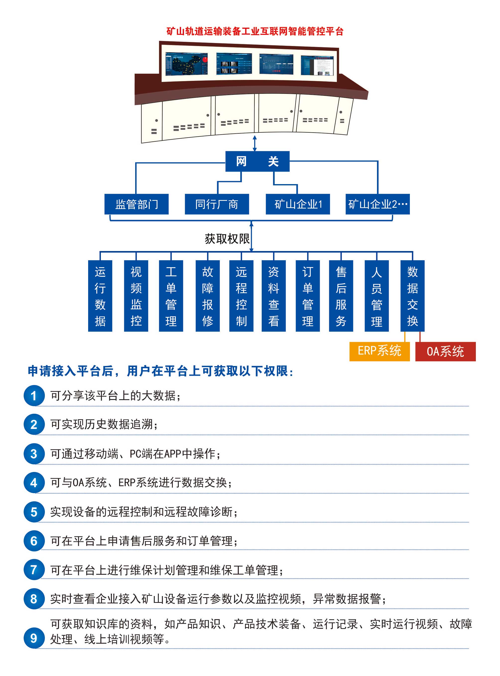 平臺用于對礦用礦山軌道運輸智能裝備進行實時監(jiān)控、運行預(yù)報警、遠程智能故障診斷以及數(shù)字運維服務(wù)等,并通過工業(yè)APP實時調(diào)度設(shè)備運維服務(wù)人員,及時處理設(shè)備故障,以提升礦山軌道運輸智能裝備的安全運維保障。平臺被列入湖南省“數(shù)字新基建”100個標志性項目名單,2022年5月平臺通過了省級驗收,成為全省十八塊“湖南省工業(yè)互聯(lián)網(wǎng)平臺”之一,平臺的工業(yè)APP入選“湖南省2021年優(yōu)秀工業(yè)APP”。