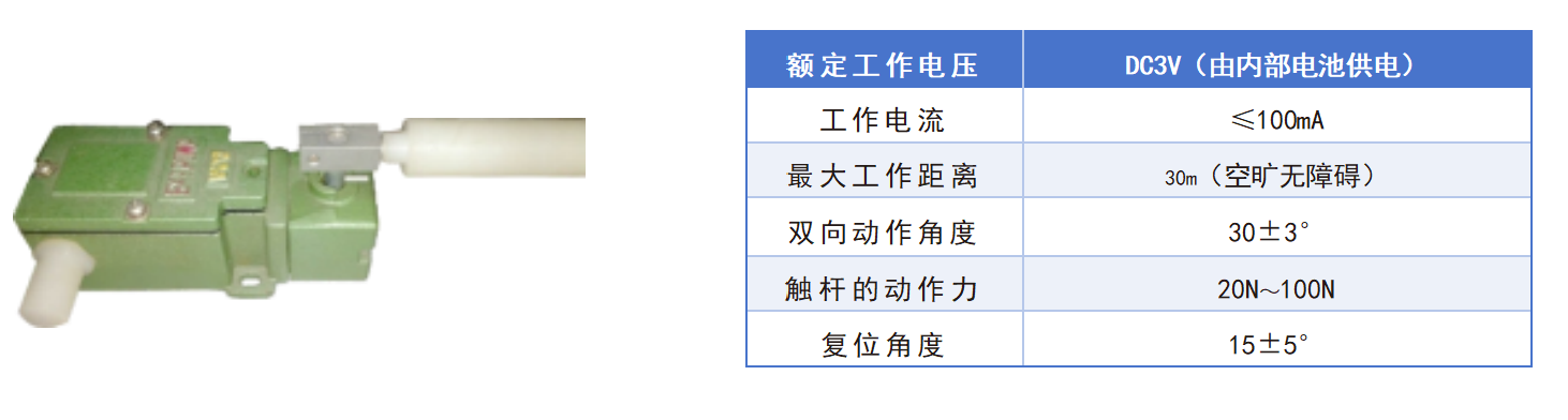采用單級雙向跑偏開關(guān),具有體積小、重量輕、強(qiáng)度高的特點(diǎn);觸桿外套阻燃尼龍棒,能靈活 滾動伸縮,具有耐磨、適用性強(qiáng)的特點(diǎn)。主要應(yīng)用于煤礦輔助運(yùn)輸設(shè)備的電氣信號檢測。