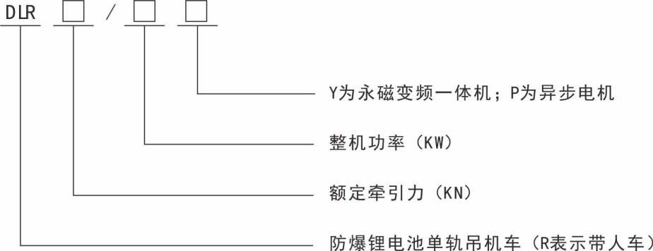 示列:型號(hào)DLR392/168Y表示額定牽引力392KN,驅(qū)動(dòng)電機(jī)整機(jī)總功率168KW的鋰電池單軌吊機(jī)車。