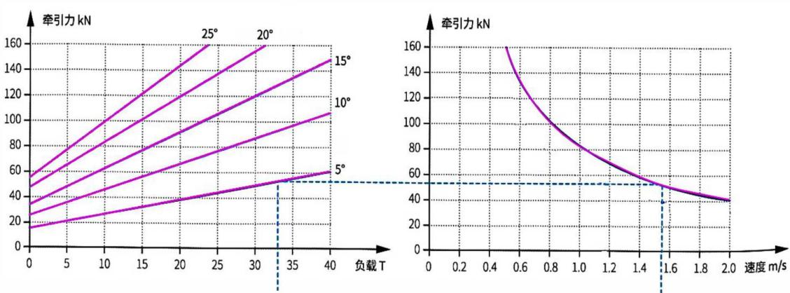 例如:DLR168/72Y單軌吊負(fù)載33T,在爬5°坡時(shí)速度為1.54m/s