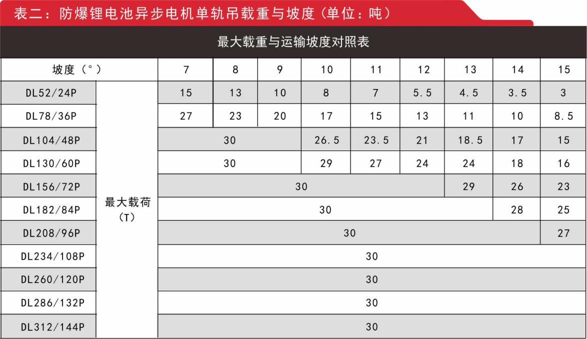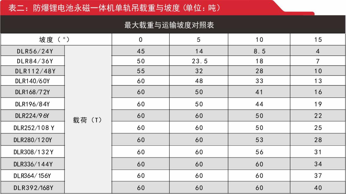 1.防爆鋰電池永磁一體機(jī)單軌吊參數(shù)及負(fù)載表