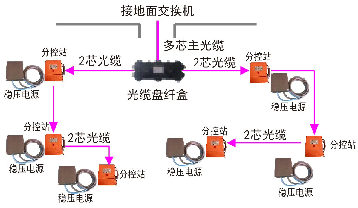 ◆ 多芯主光纜直接連接至地面交換機(jī),利用光纜盤(pán)纖盒分支連接至分站。