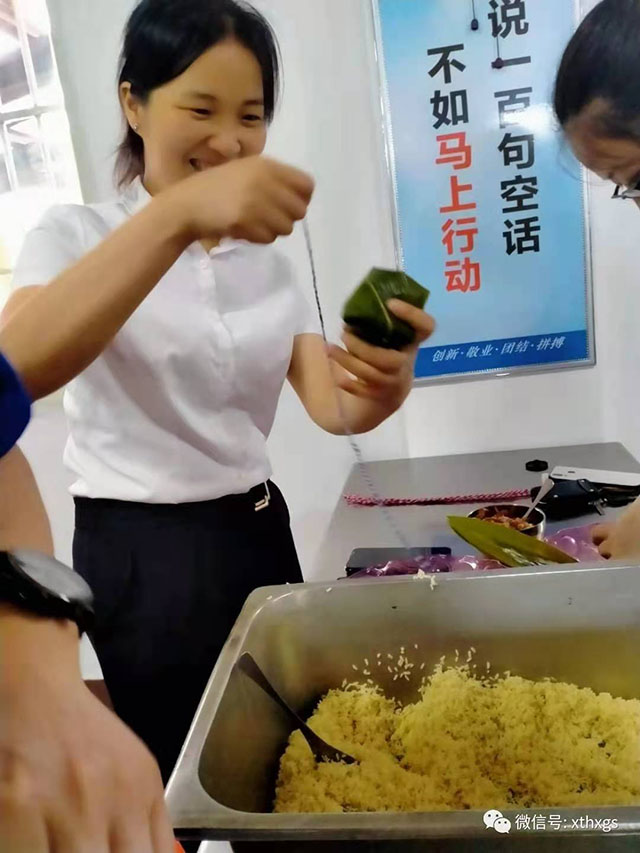 本次比賽共分為21組,每組4人,角逐"數(shù)量最多獎(jiǎng)”和“最美粽子獎(jiǎng)”。比賽前,進(jìn)行了關(guān)于端午節(jié)相關(guān)知識(shí)及【中國銀行】和【湘潭恒欣】企業(yè)文化知識(shí)搶答。隨著【中國銀行】周行長吹響比賽口哨,活動(dòng)氣氛高漲,平時(shí)在車間搬鐵動(dòng)械、在家翹著二郎腿的大老爺們也開始像模像樣地“捉粽子”了;上得廳堂、下得廚房的女士們輕松地包了一個(gè)又一個(gè)有棱有角粽子。雖然比賽只有十分鐘,但速度可不慢,最快的一組共包了40多個(gè)粽子哦。【湘潭恒欣】同事們說往年都是買粽子吃,今年可以吃到自己親手包的粽子,感覺特別好,特別幸福,印證了習(xí)大大的金句:“幸福是奮斗出來的”。